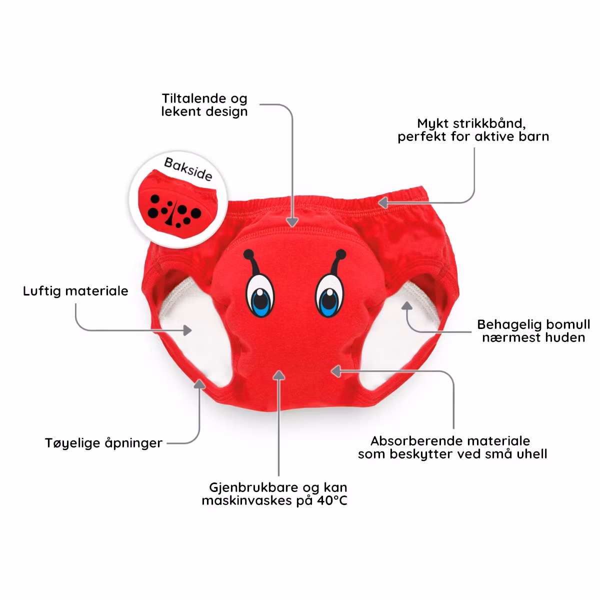 Potten har et praktisk håndtak som gjør den enkel å bære for både små og store. Barnet kan enkelt ta med seg sin egen potte, noe som gir trygghet og hjelper til med å unngå situasjoner under pottetreningen der barnet ikke føler seg komfortabel. Pottetreningsbuksene har et mykt bomullstoff nær huden og er behagelige å ha på seg. Buksene beskytter mot små uhell med et vannavvisende lag mellom myk og behagelig bomull.
