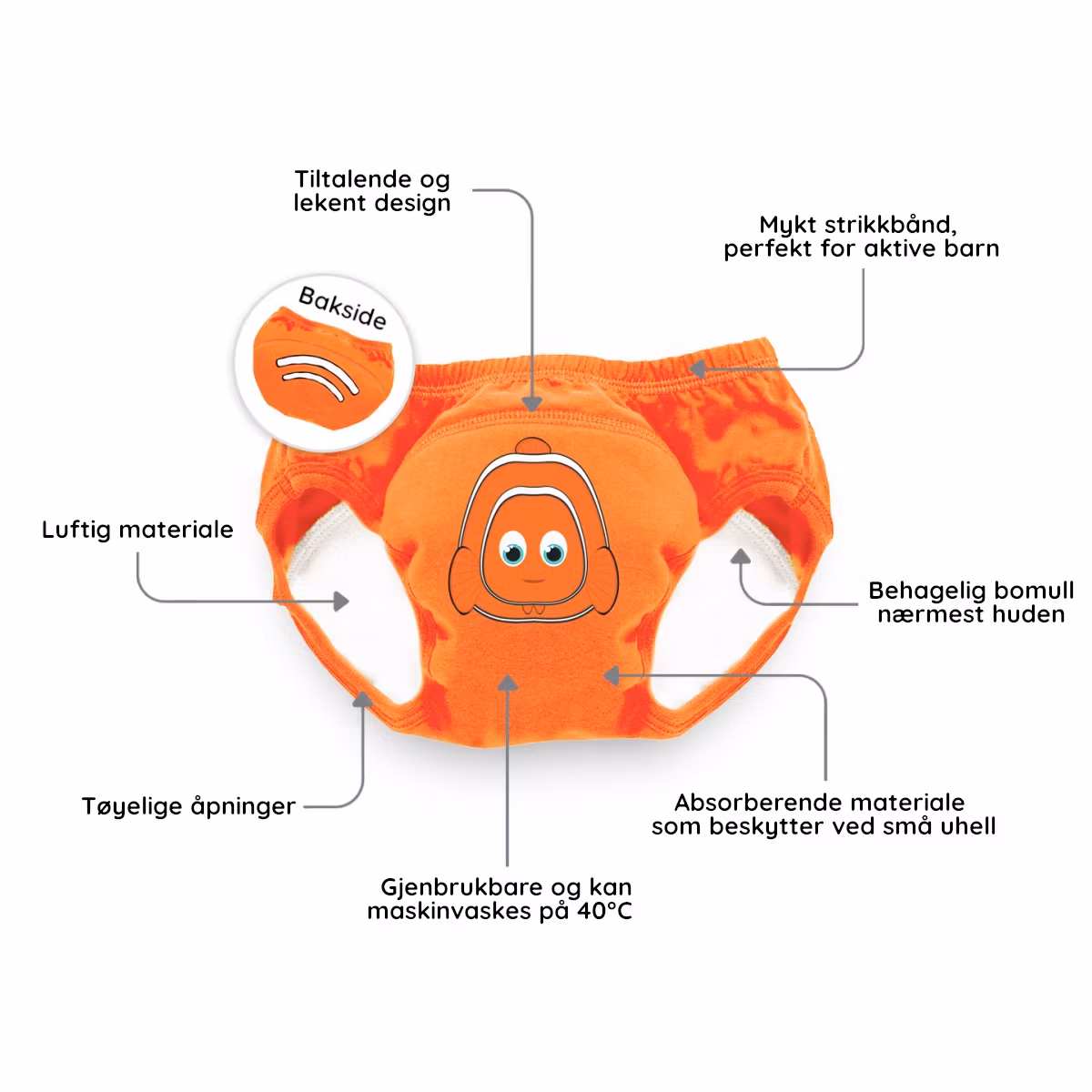 Komfortable og med god passform er de perfekte for at barnet skal kunne unngå bleier under pottetreningen. Et praktisk elastisk bånd gjør det også enkelt for barnet å trene på å dra opp og ned buksen selv. Kan maskinvaskes ved 40 grader.