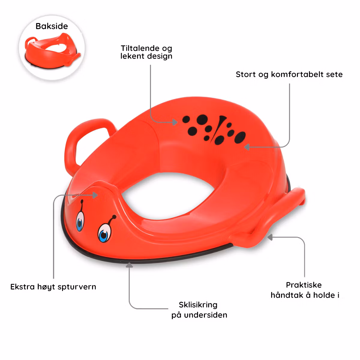 Toalettsetet har en vel gjennomtenkt design med en stor, behagelig sitteflate og et ekstra høyt sprutbeskyttelse. Praktiske håndtak for barnet å holde i og en praktisk løkke for enkel opphenging. Badromskrakken har antisklitassar på oversiden, og begge produktene har sklisikring på undersiden for ekstra trygghet. Laget av 100% resirkulerbart materiale, er My Carry Potty sett med toalettsete og baderomskrakk også et miljøvennlig valg.