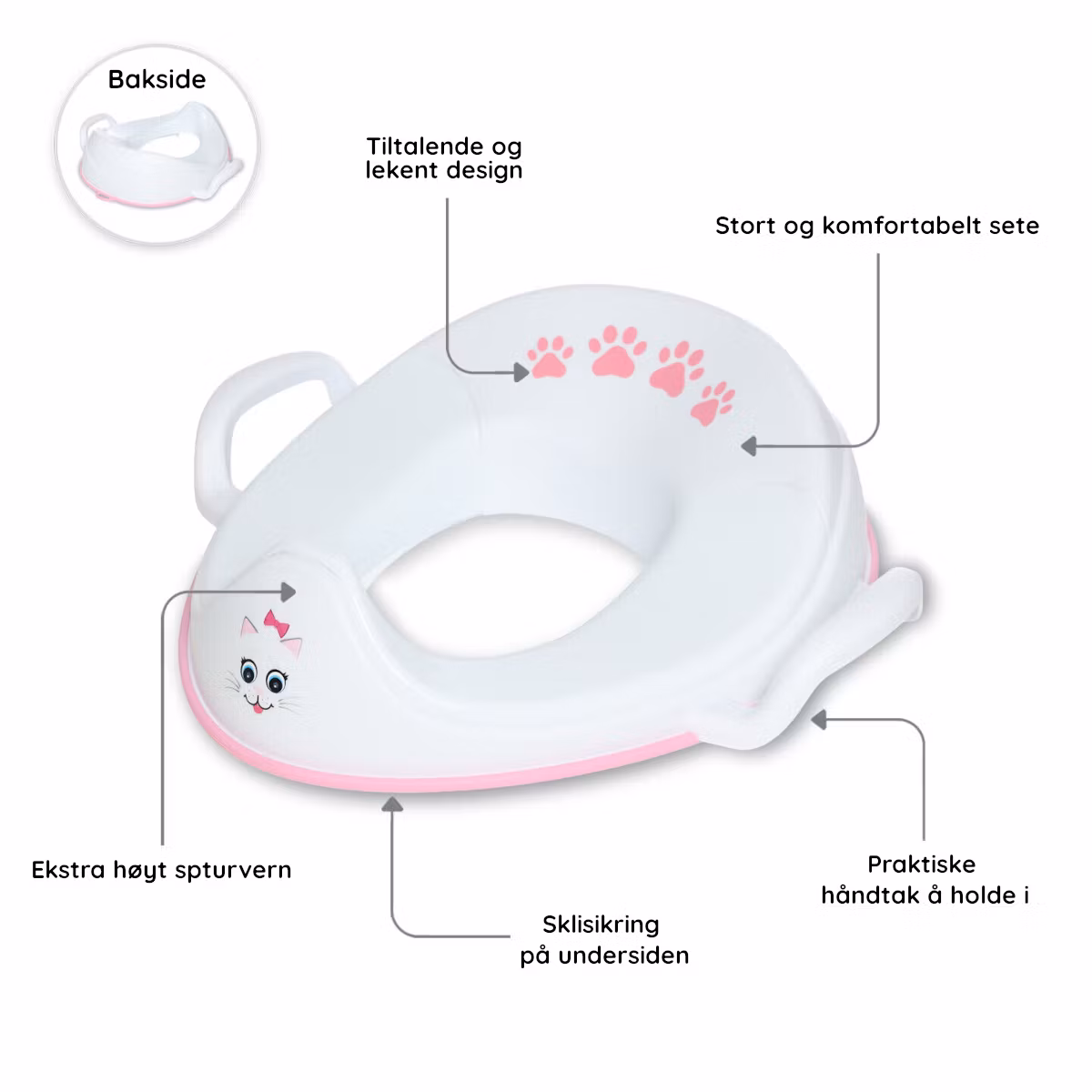 Det vanlige toalettet kan føles stort og skremmende, og et barnetilpasset toalettsete gjør toalettet mer innbydende og egnet for barn, får barnet til å føle seg mer komfortabelt og gjør overgangen til å begynne å bruke toalettet enklere og morsommere.