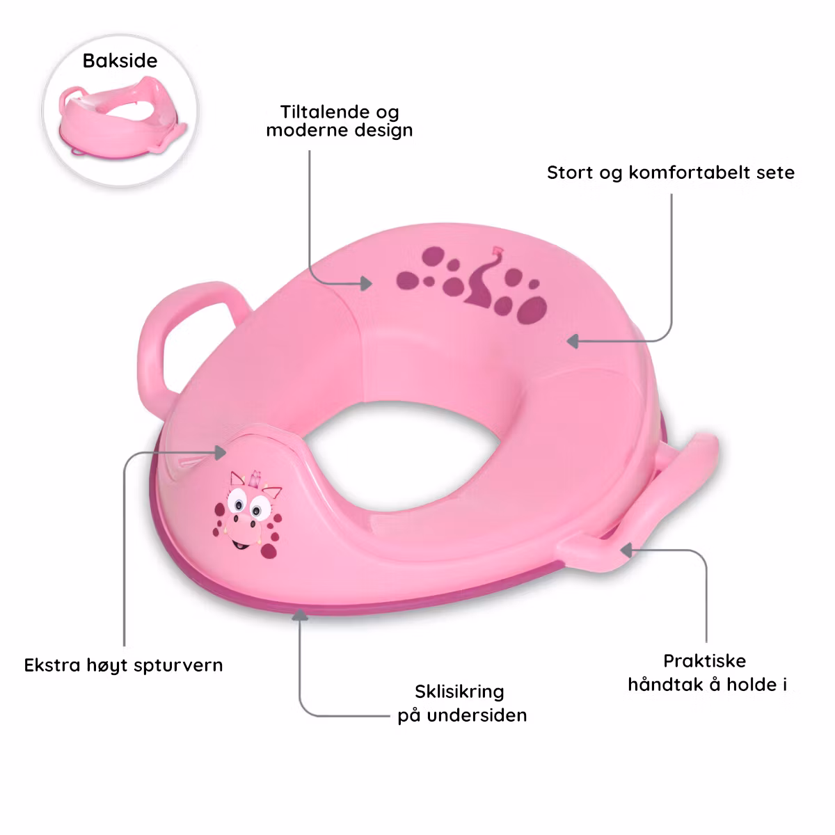 Når det er tid for barnet å begynne å bruke det vanlige toalettet, hjelper vår fine toalettsete med å gjøre toalettbesøket morsommere og mer komfortabelt.