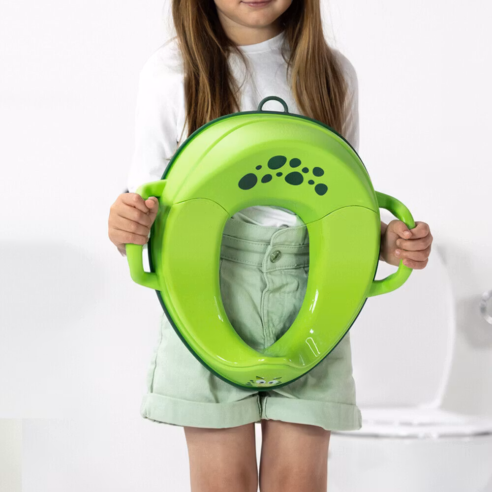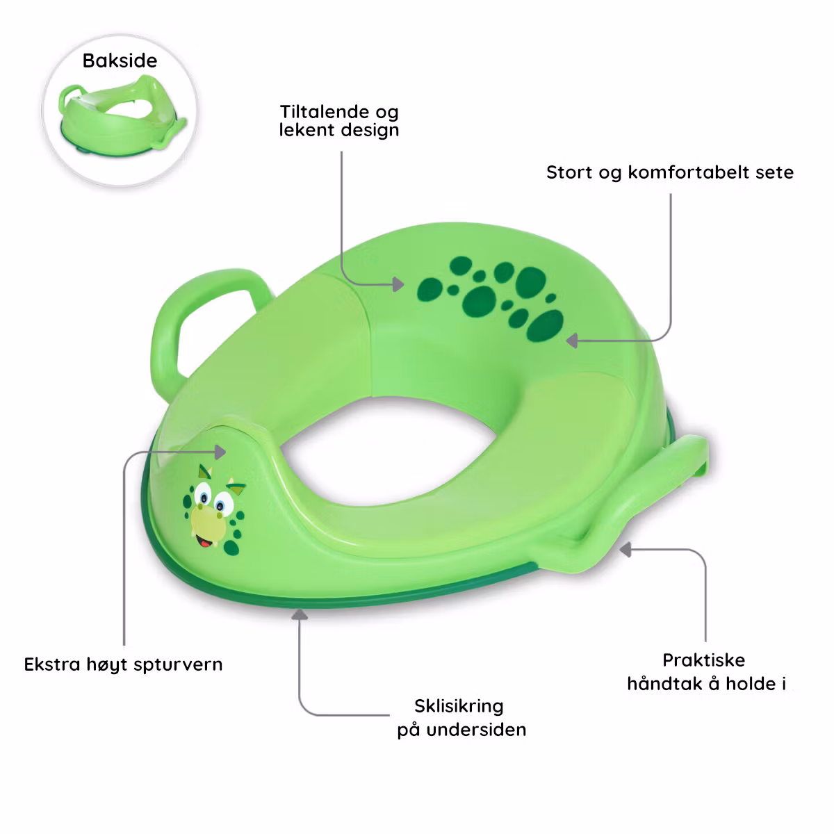 Vårt toalettsete har en vel gjennomtenkt design med en stor, behagelig sitteflate og en ekstra høy sprutbeskyttelse. Praktiske håndtak for barnet å holde i, og det er også en praktisk løkke for enkel opphenging. Baderomskrakken har antiskliputer på oversiden, og begge produktene har sklisikring på undersiden for ekstra trygghet. Laget av 100% resirkulerbart materiale, er My Carry Potty sett med toalettsete og baderomskrakk også et miljøvennlig valg.